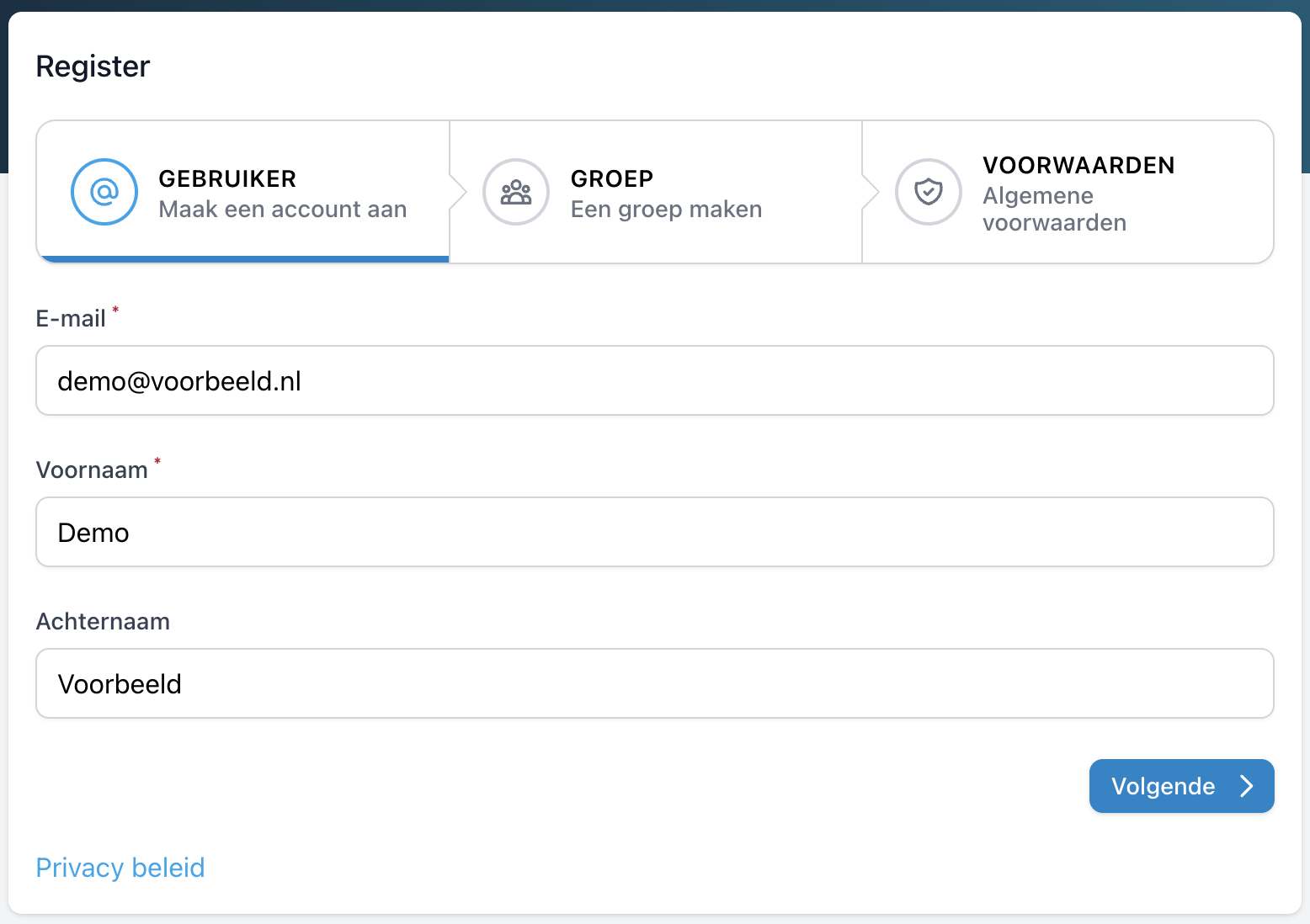 Klik op volgende voor de laatste stap. Na accepteren van de algemene voorwaarden en het bevestigen van de registratie ontvang je een e-mail om je registratie te voltooien. In de e-mail staat een link om wachtwoord aan te maken.